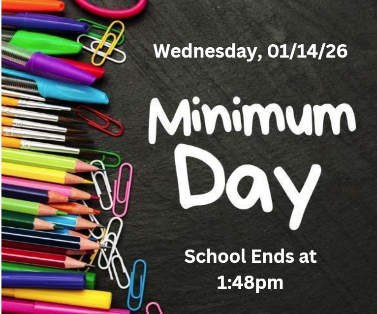 Reminder: Wednesday (01/14) is a Minimum Day and students will be dismissed at 1:48pm. Please plan accordingly for pick-up and after-school arrangements. Thank you.